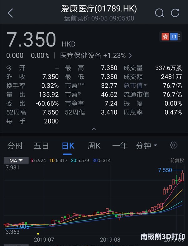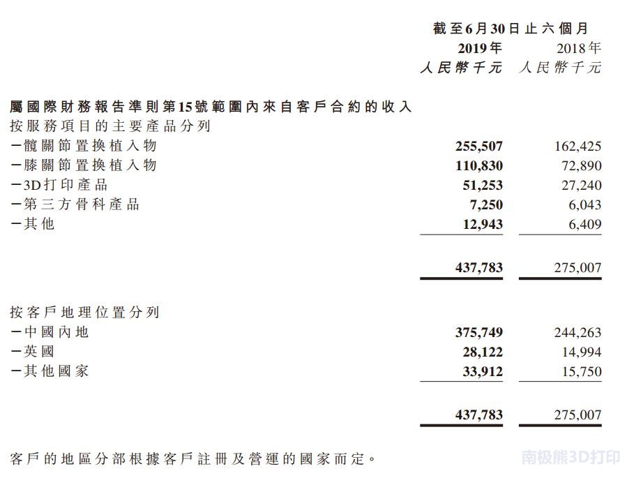 2019年8月,南極熊注意到,愛康醫療(01789)發布2019年中期業績,該集團于期內收入為4.38億元人民幣(單位下同),同比增長59.2%。毛利為3.046億元,同比增長59.6%。其中骨科3D打印植入物收入5125萬元,暴增88%,占總收入的11.7%。公司權益股東應占利潤為1.29億元,同比增長81.5%。每股基本盈利為0.12元,不派息。